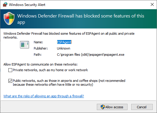- Tap Allow access to allow ESP Agent on public and private networks
